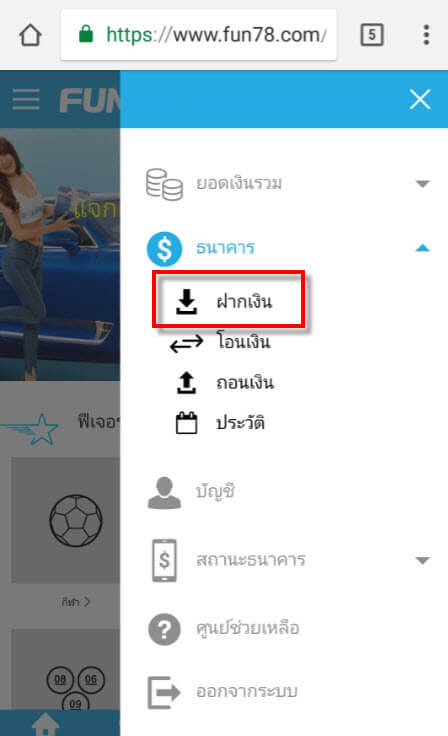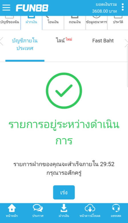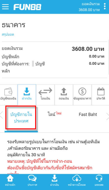 วิธีฝากเงินเข้าบัญชี FUN88 แบบบัญชีภายในประเทศ (มือถือ) - thaifun888.com