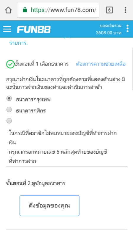 3.คลิกเลือกธนาคาร  > ดึงข้อมูลเพื่อดูเลขที่ธนาคารของ Fun88 (หากท่านได้ทำการโอนเงินแล้ว ให้ไปที่ขั้นตอนต่อไปได้เลย)